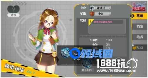 娜塔莉娅妹子的军衔是少尉,专业是通讯兵,初始人物属性是为您的坦克增加100点生命值、免暴增加3%、装甲增加10点。初始技能为紧急救护I,效果为当玩家坦克生命值低于50%时,每秒治疗10点伤害,持续10秒。