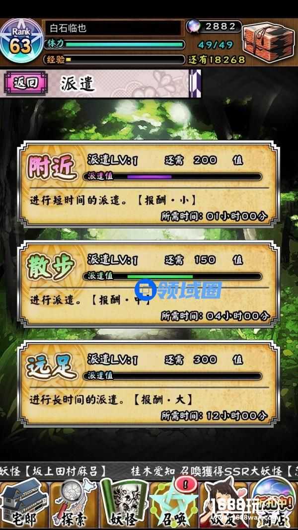派遣可以选择一只妖怪在一定时间内到达目的地获得素材,残余时间可以透过消费体力缩短后即时完成。