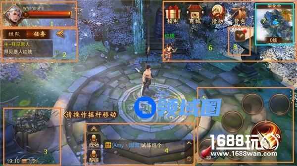 3、虚拟摇杆: 滑动摇杆,可以改变角色方向,控制角色行走。
