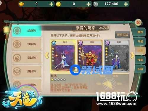 天子的品质主要用星级来划分,星级越高属性越强,就算一星的天子也无需担心,集齐天子之魂即可对天子进行升星。而在战力为尊的三界之中,天子自身也可带来强大的战斗力。在获得自己心仪的天子后,升星、打造、强化才是使天子战斗力获得更大的提升。强化所需的强化石,及打造时所需的裁缝布均由副本和天子之路产出,也可在商店购买。