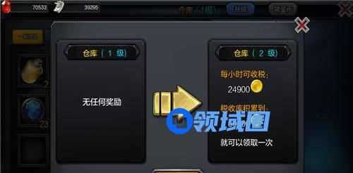 消耗点券升级,升级后每小时可以获得额外金币奖励。仓库升级到2级以后才能领取金币,并且每天只能领取两次,第一次和第二次领取间隔根据仓库等级决定