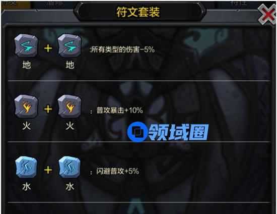 符文套装:通过镶嵌符文套餐,具有额外的加成效果,在符文界面点击左边的“符文套装”查看到具体的符文套装,不同的符文组合搭配可以达到不同的效果。