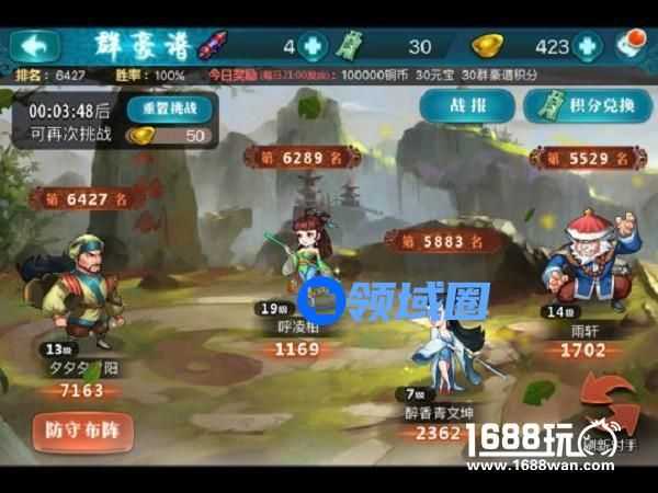 这玩家每次进入群豪谱进行挑战时,会有3个不同战力的对手供玩家选择,玩家根据观察对手的阵容来进行配阵,一举将其击败以提升自己的排名。如果觉得当前对手较为难缠,可以直接刷新,每次挑战后需要等待近5分钟的冷却时间,每天一般可以挑战5次。