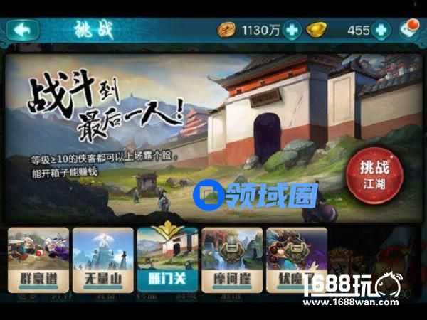 游戏的挑战模式主要分为五种,其中包括:群豪谱、无量山、雁门关、摩珂崖、伏魔录。