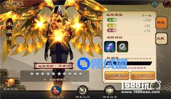 在神翼血脉界面,左部为当前佩戴神翼的形象展示和当前血脉的等阶,每次进阶成功都会点亮一个星。10星全亮就可以进阶为下一血脉。