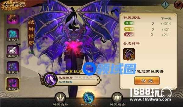 右部为当前级别时神翼加成属性和下一级时增加的属性;以及神翼合成的材料。