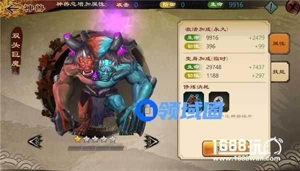 右部为此神兽当前修炼级别下永久激活加成的属性和下级增加的永久属性,还有当前修炼级别变身后临时增加的属性和下级变身后临时的增加属性;以及修炼所需的材料。