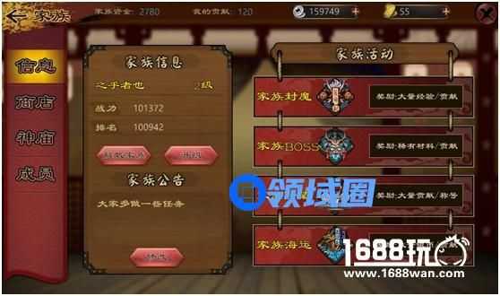 参加每一项活动都可以赚取大量的家族贡献,家族贡献可以用以在家族商店中消费,购买一些强力的物品,不管玩家实力如何,只要积极参加家族活动,都可以获得贡献。