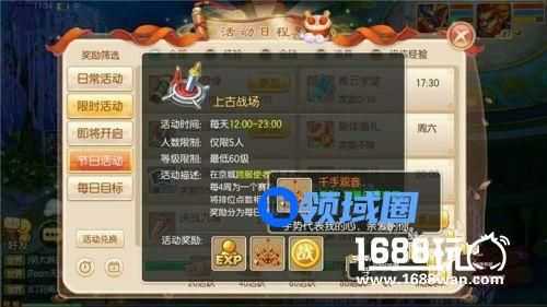 在“活动日程”左侧的“限时活动”分类下可以找到【上古战场】,在活动时间内点击“参加”即可自动寻路到报名跨服活动的NPC跨服活动接引人处(→_→或者点开地图自己找路过去也行,他在京城的擂台旁边站街)。