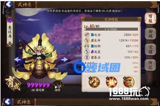 因为脸比较黑,所以御魂属性很一般,不过即便如此,惠比寿高血量成长也把血量撑到了3万2,效果抵抗在73%,速度169。