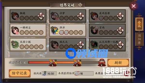 可以看到,如果你有九张突破券,每打三个就刷新一次和不刷新一次打完九个获得的勾玉是一样的。其中的区别就是后者会多14个勋章+一张灰符。