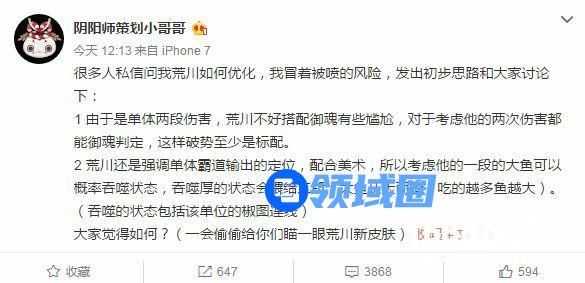 2 、荒川还是强调单体霸道输出的定位,配合美术,所以考虑他的一段的大鱼可以概率吞噬状态,吞噬厚的状态会喂给二段(大鱼从天而降,吃的越多鱼越大)。(吞噬的状态包括该单位的椒图连线)
