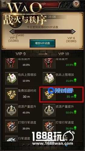 提升VIP等级也可以提升建筑免费加速时间,VIP10级建筑免费加速时间为35分钟,也是加快建筑升级的一个小途径。VIP点数可以通过每日登录免费获取,也可以在商城购买获得。