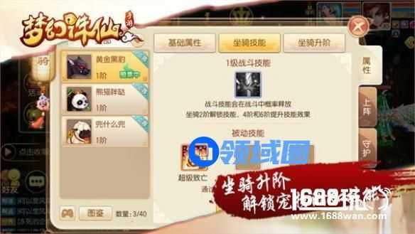 《梦幻诛仙手游》中坐骑可以通过该坐骑的碎片道具和坐骑道具来增加积分提升阶位,每种坐骑都有一个能够增加角色状态的附带技能,例如熊猫胖哒坐骑附加有概率增加施法者治疗效果的技能;兜什么兜坐骑附加有概率增加保命效果的技能等。而坐骑升阶也可以获得宠物附加技能,每个坐骑附带的技能都不同,分为速度的提升或降低,物理防御,法术防御、物理伤害、法术伤害的提升。每次升阶的技能是随机获得的,但是玩家可以根据自己的需求通过道具洗筋伐髓丹道来重置宠物附加技能,让坐骑也变得多才多艺哟!
