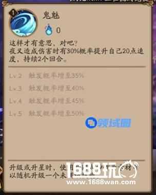【鬼魅】被动技能,夜叉造成伤害时有30%(35%,40%,45%,50%)概率提升自己20点速度,持续两个回合。