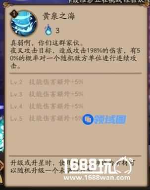 【黄泉之海】三火技能,夜叉攻击目标,造成攻击198%伤害,有50%的概率对一个随机敌方单位进行连续攻击。
