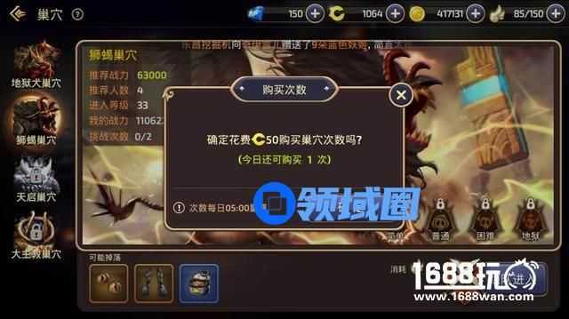 1、每天可以挑战免费两次,还可以使用50龙币再购买一次,就是三次,难度分为简单、普通、困难和地狱,需要通过前面的难度才可以选择下一个难度。