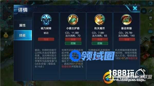 机关魔爪:刘禅会操纵机关熊猫爪向前攻击,对一定范围内的敌人造成伤害并眩晕对方。这个技能在团战中的效果非常棒,不过由于攻击距离比较短,需要尽量靠近敌方英雄后在释放此技能。