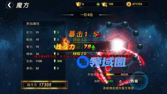 玩家需要不停收集并吞噬精血(一种在各种秘境、任务、登录奖励中会掉落的材料,也可以通过交易行/摆摊进行购买,额,总感觉哪里怪怪的= =)来升级魔方等级,从而增加人物各项属性值(作为人物被动属性叠加在战斗中产生效果),所以魔方也是提供战斗力的一大来源哦!