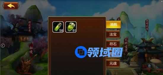 在界面右下角有一排功能按钮~上图左起第3个的背包模样的图标。此处便是背包所在。点击进入背包后,右侧出现五个竖向排列的按钮。第一个是消耗,接下来分别法宝,符石,成长,元魂。背包容纳物品以这五类划分。