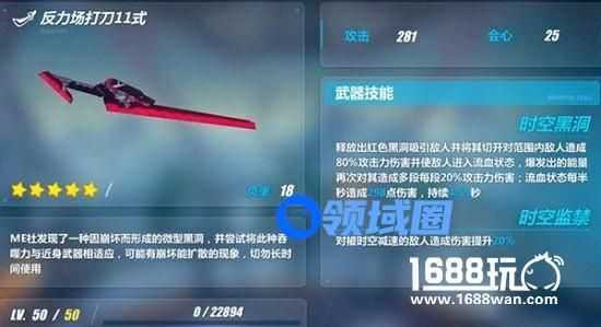 在所有通过扭蛋方式产出的太刀中,【反力场打刀11式】是除了【磁暴·斩】外攻击力最高的一把武器,四星满级状态下(LV.35)可以达到攻击179、会心15的面板,满属性后更是能达到攻击281,会心25的“傲人身段”,足够用来应付噩梦模式等高难度关卡。同时血红的刀身非常吸引眼球。