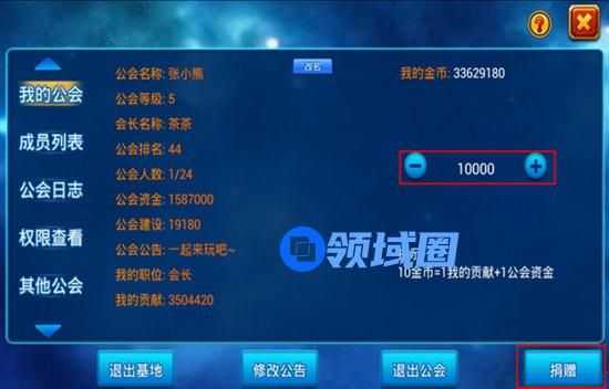 公会成员可以在公会面板中点击"公会捐献",在弹出的"公会捐献"面板中进行捐献。玩家每捐献10金币可以获得1点公会贡献,同时,公会增加1点公会资金。