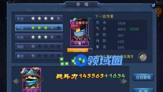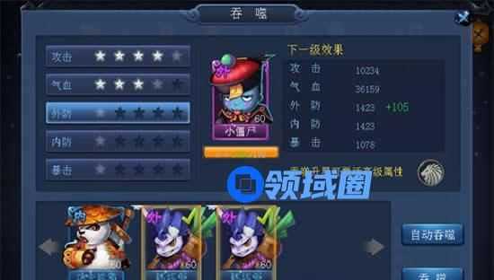 通过宠物吞噬,可以为进行吞噬的宠物提高攻击/气血/外攻/内攻/暴击的属性