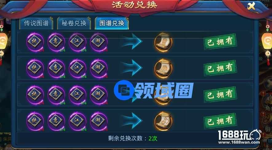 9、开服七天后游戏内会出现“活动兑换”图标,可以用快、意、江、湖兑换完美战盔、完美战靴、完美护腿、完美项链图谱。