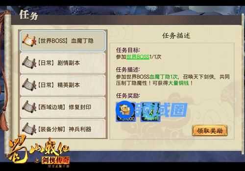 为了救回魔化的丁隐——血魔丁隐,各位剑侠每天12:00~12:30和19:00~19:30都会聚集在一起,共同压制他的魔性。由于过于危险,所以只 有等级达到35级以上的剑侠才能参与此活动。值得一提的是,世界boss血魔丁隐若在5分钟内被消灭,系统就会在第二天提升boss等级;若玩家未能消灭 血魔丁隐,那么第二天boss等级就会下降。这就意味着,玩家面对的魔化丁隐总是符合玩家水平的,不会被各位剑侠太轻易的打败,更不会难到让大家难以战 胜,丧失游戏快感。