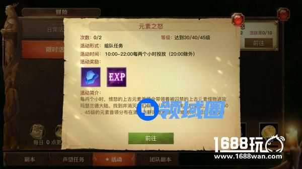 点击“活动”——元素之怒——组队或自己创队,他就会送你过去的。但最好自己熟悉地图。光明大陆的地图实在你逆天的大和精彩,风光无限,慢慢欣赏。