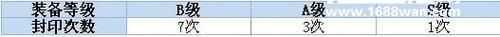 封印之印用于B级以上绑定装备,封印次数如下图所示。要想封印装备,就要有封印之印和绑定状态的B级以上装备。