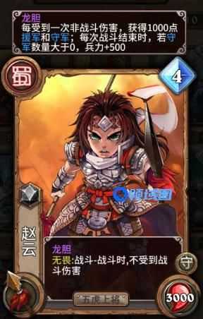 比较实用的一张黑卡,单卡正常最高收益6000,带武器更多,带铁索七星配合“龙胆”简直丧心病狂,而且如果赵云在出阵击杀了对手,把无畏卡在这里,对手可真是有苦难言。