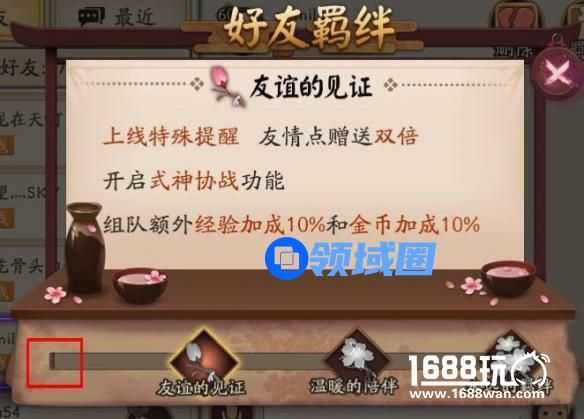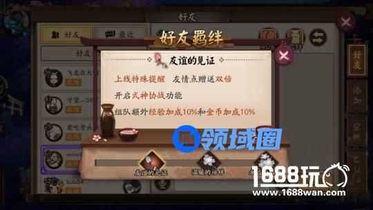 达到第一级“友谊的见证”可获得:上线特殊提醒、友情点赠送双倍、式神协战(就是带着好友的式神刷狗粮)、组队额外经验加成10%和金币10%。