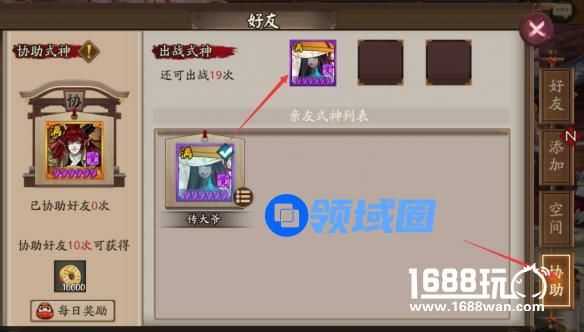 你也可以将自己的式神上架,供好友使用。协助好友奖励每日协助好友十次可以获得1W金币奖励。