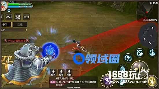【半石人钢铁克罗技能招式3:冲击电波】如图,此技能很像七龙珠里面的龟波气功,释放的时候地上会出现红色提示,然后Boss施法前摇,最后打出强有力的电波。此技能伤害高持续时间长,距离超远,不幸被击中会被长偶时间控制被掉血,就算有霸体也只是暂时的,霸体结束依然被控,可谓是Boss主要输出技能之一。此技能只能提前预判,除非谷民们有大招,虽不被控依然掉血。