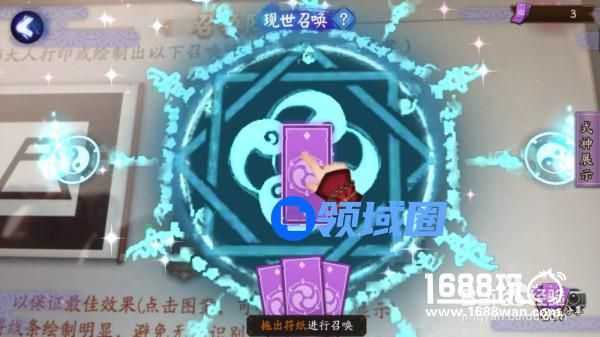 接着将摄像头对准召唤阵,就是准备中的那两张图纸,出现蓝色的召唤阵后,拖动下方的召唤符到阵中