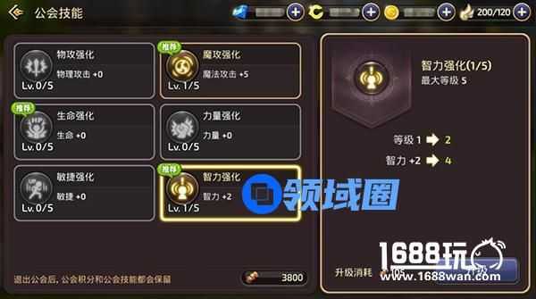 既然知道了1点智力带来的收益,我们再回到公会技能中。1级魔攻强化可以提升5点魔法攻击,1级智力强化则可提升2点智力,也就是1.6魔法攻击,60最大魔法及0.8魔法防御,所以1级魔攻强化所带来的输出收益要高于1级智力强化。而2级魔攻强化提升10点魔法攻击,2级智力强化提升4点智力既3.2魔法攻击;3级魔攻强化提升15点魔法攻击,3级智力强化提升6点智力4.8魔法攻击;4级魔攻强化提升20点魔法攻击,4级智力强化提升8点智力6.4魔法攻击;5级魔攻强化提升25魔法攻击,5级智力强化提升10点智力8点魔法攻击。所以说魔攻强化带来的魔法攻击收益要远高于智力强化所带来的攻击收益。因此在魔攻强化及智力强化的选择上,推荐优先选择魔攻强化,之后选择智力强化,最后则是生命强化。
