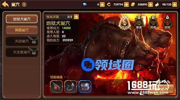 巢穴现在共分4大巢穴,分别是地狱犬巢穴,狮蝎巢穴,天启巢穴以及大主教巢穴。每个巢穴的进入的要求也是不同的。比如地狱犬巢穴推荐战力14000,进入等级20级;而狮蝎巢穴推荐战力则为55000,进入等级34级。不同的巢穴要求是不相同的,同时难度也肯定是不一样的啦,而每个巢穴获得的材料,则可以制作相对应的装备套装。比如地狱犬巢穴掉落的材料可以制作地狱犬套装。