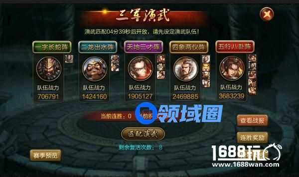 对战前要先确定出战阵型,一共需要设置5个出战阵型,5个阵形可上阵的武将数各不相同,一字长蛇阵必须出战1个武将,二龙出水阵必须出战2个武将、天地三才阵必须出战3个武将、四象两仪阵必须出战4个武将、五行八卦阵必须出战5个武将。
