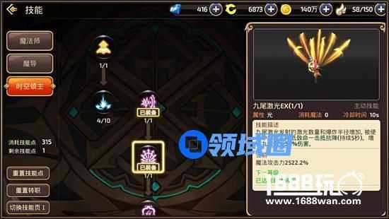 55级第二个EX技能:九尾激光EX——九尾激光是一个发射数道弧形激光的技能,对手如果收到攻击,会被击退硬直,并且激光的落点处会造成击飞效果,全吃一个九尾的伤害非常恐怖,比聚能激光伤害还要高出许多。EX强化之后,它的激光数量和爆炸半径增加,也就是范围和伤害段数都变得更大更多,被击中的玩家还会受到致命一击抵抗下降的Debuff持续5秒。那么这个技能一旦被第一段伤害碰到,其实后续的伤害都很容易造成暴击,无形中增加了技能的伤害。同样这是一个无论PVE还是PVP都必带的技能,非常好用。【60级】