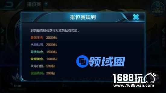 每个赛季结束是,所有参与排位赛的玩家将根据本赛季所达到的最高段位获得对应的钻石奖励,最强王者3000钻、永恒钻石2000钻、尊贵铂金1500钻、荣耀黄金1000钻、秩序白银500钻、倔强青铜300钻。