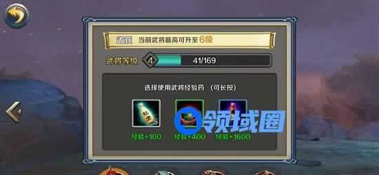武将升级可通过攻略关卡得到武将经验值而升级,也可以通过使用武将经验道具来升级。武将的等级无法超过主公等级。武将经验道具目前主要通过关卡掉落。