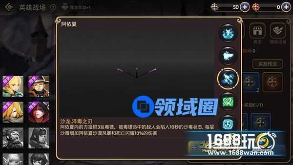 分析:又是一个AOE技能,有减速和伤害的沙漠风暴谁不闻风丧胆,敢硬接?这是一个可以任意释放的技能,所以效果特别好很容易让人猝不及防,同时可以配合一技能的沙尘之池进场使用尘影杀阵减速敌人。沙龙.淬毒之刃:阿依夏向前方投掷3发毒镖。被毒镖命中的敌人会陷入10秒的沙毒状态,每层沙毒增加阿依夏沙漠风暴和死亡闪耀10%的伤害。
