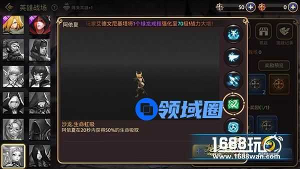 分析:不同于一二技能的近战控制,这是一个远距离伤害技能,3发毒镖命中就是10秒的沙毒简直是让人不寒而栗,同时每层可以增加沙漠风暴和死亡闪耀10%的伤害,记住了是每层,因此先手使用这个技能接上沙漠风暴就会冲散敌人的阵型打出高额伤害。沙龙.生命虹吸:阿依夏在20秒内获得50%的生命吸取。