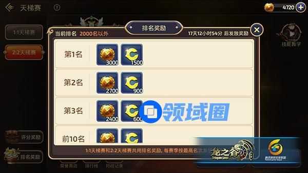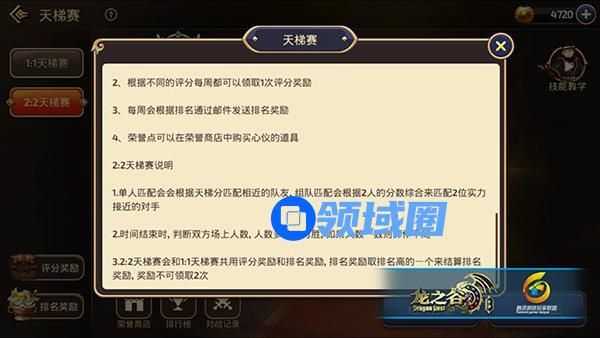 新天梯的匹配规则是按照两个人的平均天梯分来匹配对手的,所以说我们匹配的对手应该也是实力相近的玩家。当然2V2与1V1一样只有装备与等级会有小幅度的影响公平,重要的还是队友间的团队合作。每支队伍的初始分与1V1一样都是1500,赢了则加分,平局不变,输则扣分。只有在规定时间内杀死对方才会被判定为赢,否则平局,所以要把握好时间咯。当然值得一提的是为了赢得比赛,我们应该根据自己的职业特性去挑选适合的队友,否则我们就输在了起跑线上。【新天梯奖励介绍】