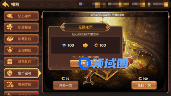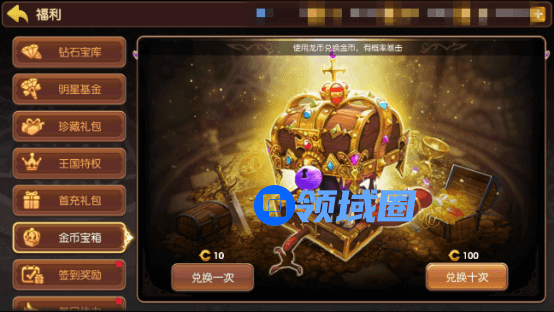 玩家可以通过在金币宝箱中通过消耗龙币来快速获取金币。通常情况下10龙币能兑换2.5W金币,但当兑换暴击时将能获得多倍金币奖励。此外,每天也有一次免费点金机会。
