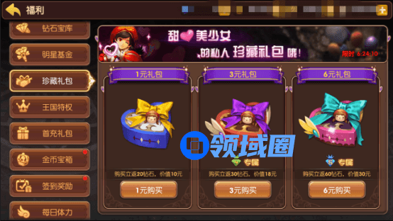 玩家只需要花一丁点钱,就可以购买得性价比极高的礼包,礼包里主要有钻石以及金币,钻石可以用于获取龙币。但购买部分礼包需要开通王国特权。
