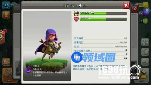隐秘弓箭手,可以说是第一大本弓箭手(MM)的升级版,基础属性基本相同,外貌略有改变,超强大的就是新增了技能隐身披风。该技能可以让MM们在短时间内隐身,不会被敌方防御建筑发现。2级MM就能解锁这个技能,初始时间是3秒。第6、8级还可以提升技能等级,隐身时间最高可延长到7秒哦!只要利用得当,用大批的MM可以轻松拔掉一个外围难搞的防御建筑,而且还是零损伤哦!