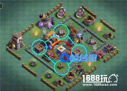 以巨石为圆心,周围布置箭塔和双管炮。另一方面如此布置往往可以将巨石包裹在阵型相对居中的位置,而箭塔位于相对边缘的位置。在敌人尚未攻入阵营的时候,周边的箭塔和炮台可以消灭正在接近的敌人和拆墙的小伙伴(没有炸弹的情形)。等到敌人攻入阵营,往往会冲向门口附近的巨石,可以在巨石成功吸引进攻火力的时候,由箭塔和炮台齐心合力愉快的消灭被吸引的士兵。巨石的皮够厚,不论是近战还是远程都要磨几下才能拆掉,这个时间足够几个防御建筑联合输出,消灭他们啦。如此联动配合,既在初期保护了巨石,也在后期保护了防御塔,加快战斗节奏,实在是很巧妙地配置哦。