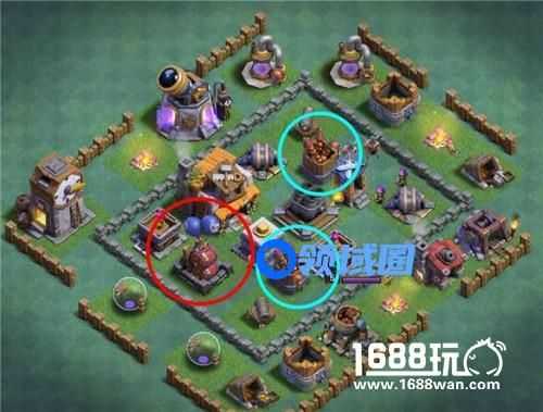 第二大本的巨石威力很大,三下震死一个胖胖,一下秒掉一群胡子,都是很平常的事情。但是他也有个致命弱点,那就是攻击半径小!真的很小!必须要近战贴上去才能打到,远程兵种零伤害磨死它!这么牛的近战兵种碾压机器不好好利用实在太可惜了!所以我们可以搭配箭塔和双管炮来布局。这样搭配是因为这两种防御建筑相对数量较多,射程和输出都比较平衡。以巨石为中心布局,方框阵可以布置在阵营的门口内侧一段距离,保证远程不能隔墙输出就好;菊花阵可以布置在一个比较有战略意义的角上。目前来讲,五本建筑也不算多,所以玩家大多都摆的方框阵,这里就重点说一下方框阵的布阵。